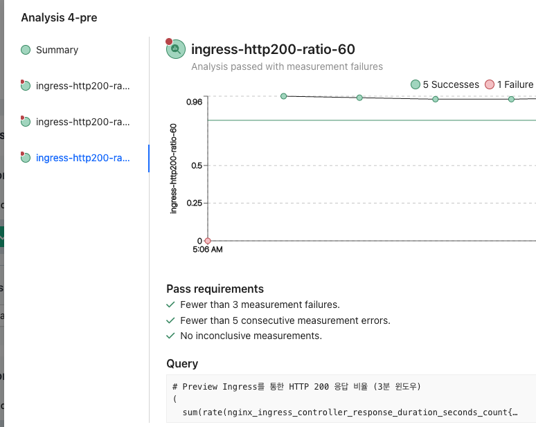 이번에는 정상적으로 배포되었습니다. 성공조건과 트래픽 조건을 통해 배포 제어를 진행할 수 있습니다.